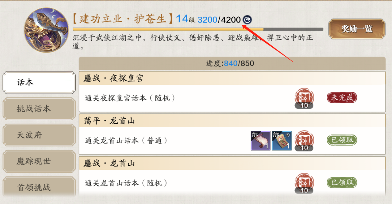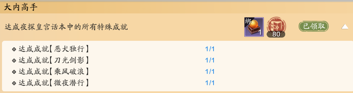 当我们成功完成这四个话本成就后,我们将自动激活“大内高手”成就。不仅有80点的成就奖励,更有永久提升四维属性的属性丹可以领取。