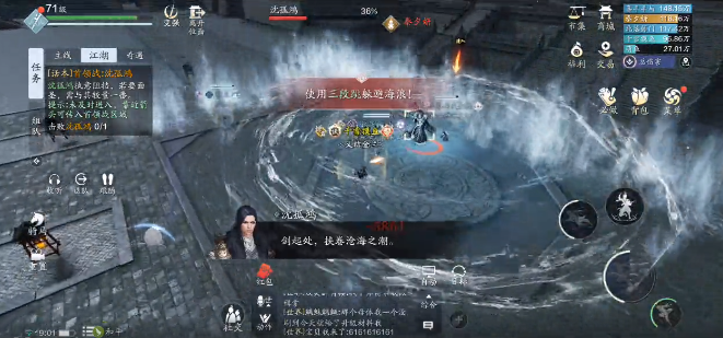 这里有几个技巧可以分享给大家。首先是中央处的旋涡,当沈孤鸿使用技能时,旋涡出现会覆盖大片区域,但仍有小部分位置不会被旋涡所波及,少侠们可以使用三段跳加飘雪穿云的形式,落在旋涡无法波及的安全位置;另外,当海浪出现的时候旋涡会消失,少侠们可以根据海浪达到的位置进行三段跳进行躲避,利用好空中触发的飘雪穿云技能,落在海浪交汇处的安全位置;最后海浪的速度并不算太快,我们可以熟练利用千斤坠技能,以便通过第一道海浪时可以快速落地,准备好面对第二道海浪时,在三段跳飞升至空中躲避即可。