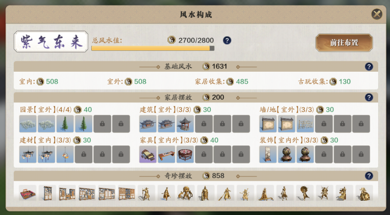 通过风水构成面板可知,家园风水值主要由基础风水、家居摆放和奇珍摆放三大部分构成。