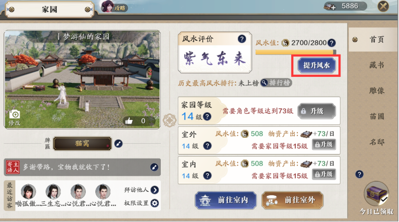 打开家园面板,然后点击“提升风水”,我们可以查看当前家园风水值的构成。