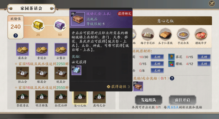 茶话会共分5种,最低品质的茶话会为绿色品质,可获得2个头饰珑铸材料和20万碎银;最高品质茶话会为金色品质,可获得6个头饰珑铸材料和60万碎银。
