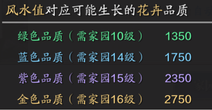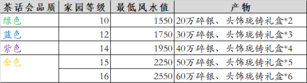 风水值和家园等级除了会对植物的品质产生影响,还会直接决定玩家能够开启的茶话会品质,详情如下: