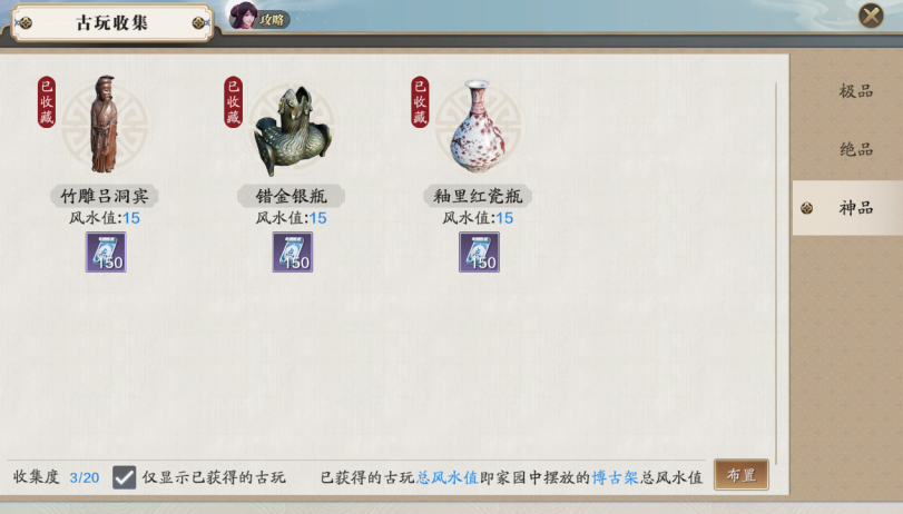 需要注意的是,仅仅收藏了古玩,其携带的风水值并不会自动生效,这些风水值还需要玩家主动去家园中布置博古架后才会生效。