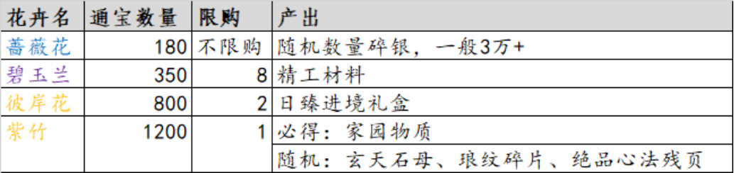 其中,种植稀有品质的花卉,可以获得碎银、精工材料、日臻进境礼盒等道具,目前最珍贵的植物,紫竹采集后必然获得200家园物质,概率获得玄天石母、琅纹碎片,或绝品心法残页。