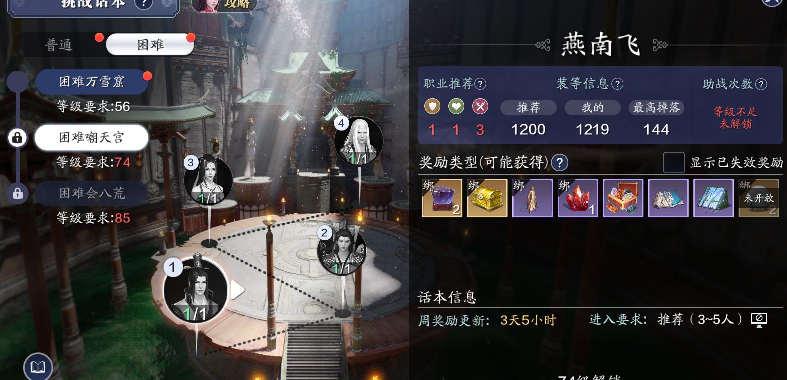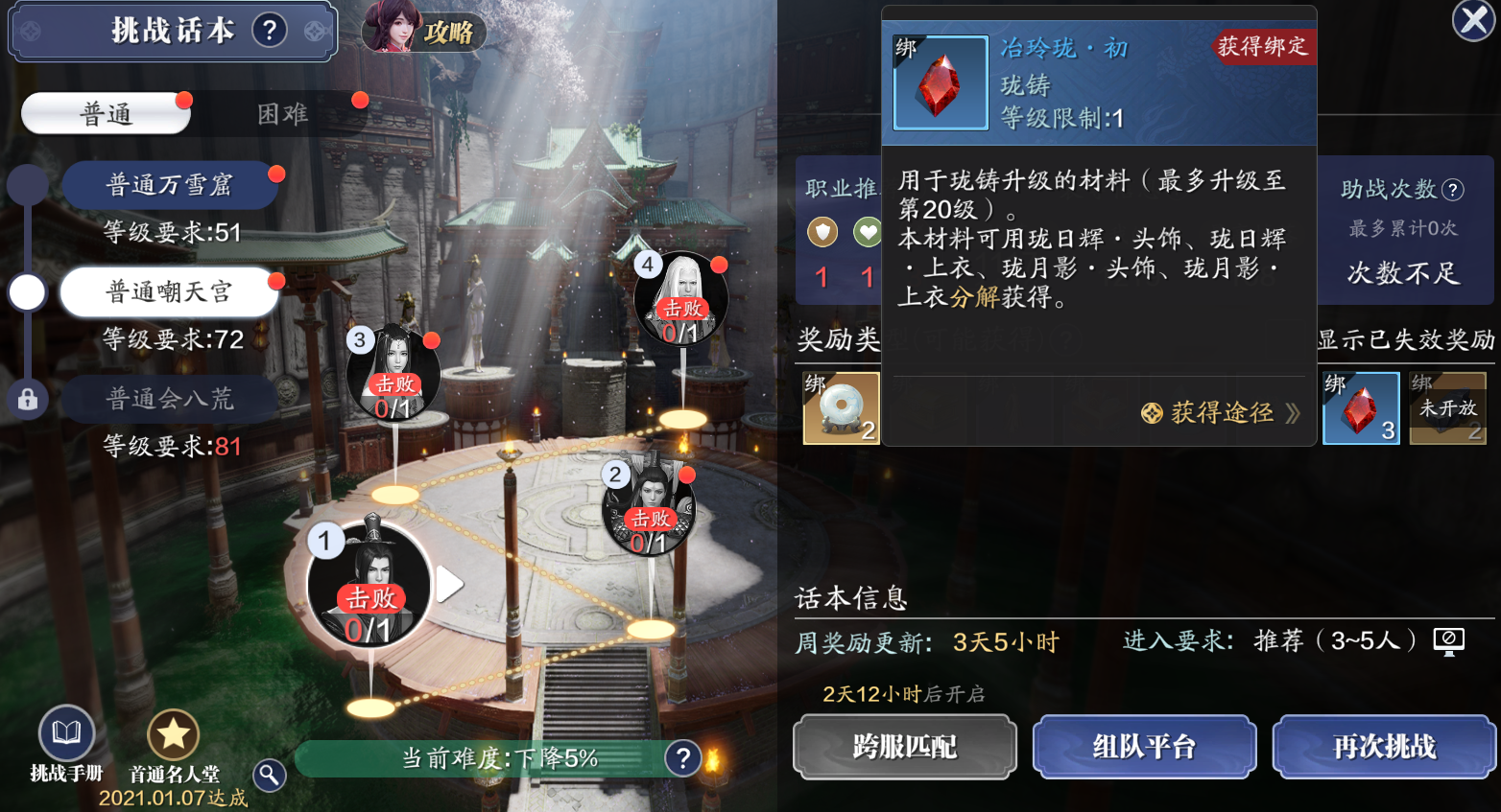 等级达到74级后,参与困难挑战本嘲天宫每个boss可以获得1个冶玲珑·深,每周共计获取8个。