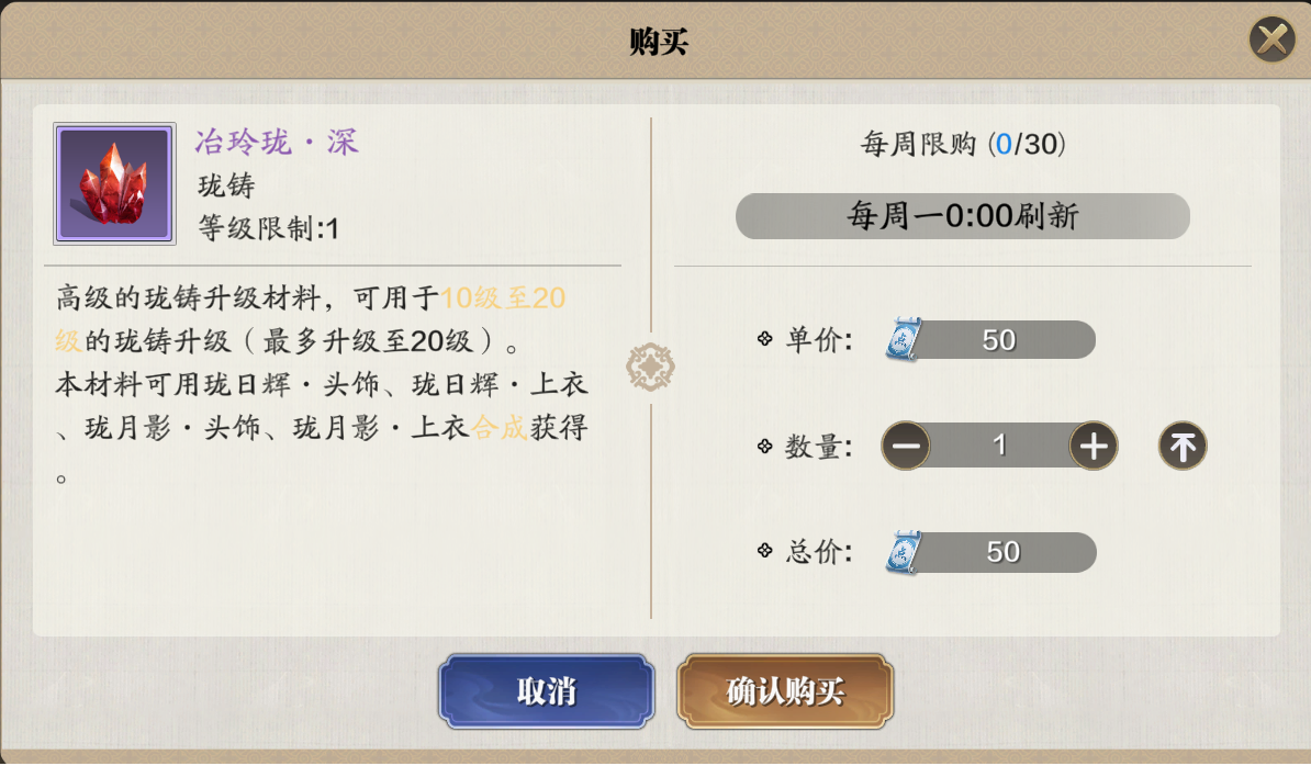 商城中,每周可以使用绑点购买30个,每个售价50绑点。这是目前最主要获取冶玲珑·深的方式。