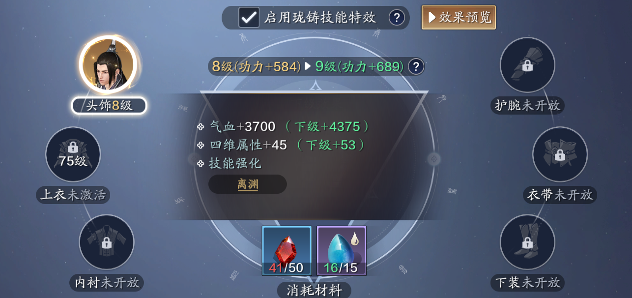 72级珑铸开放头部10级,10级全部升满之后可以获得763点功力提升。这仅仅是一个部位前10级的提升可想而知,按头部功力数据计算,如果所有部位都升级至20级,预计会有9000左右的功力加成,同时还伴随着超酷的技能特效。