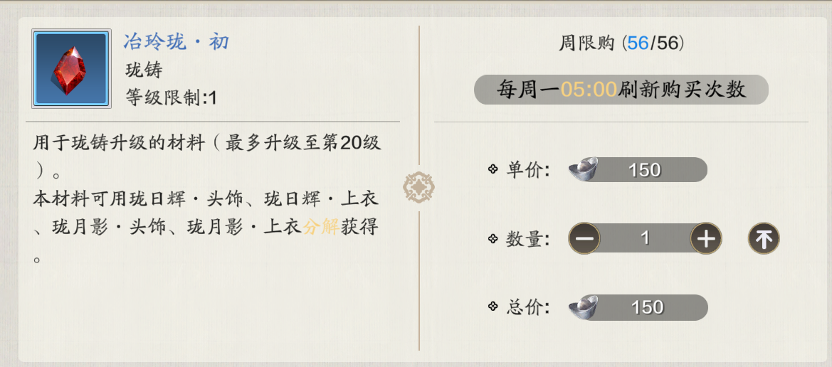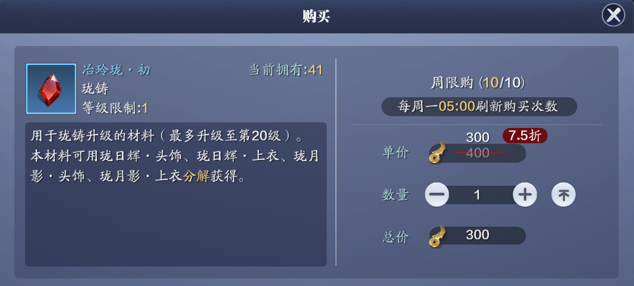 天魁币商店上架了冶玲珑·初,每个售价300天魁币,且每周限购10个.
