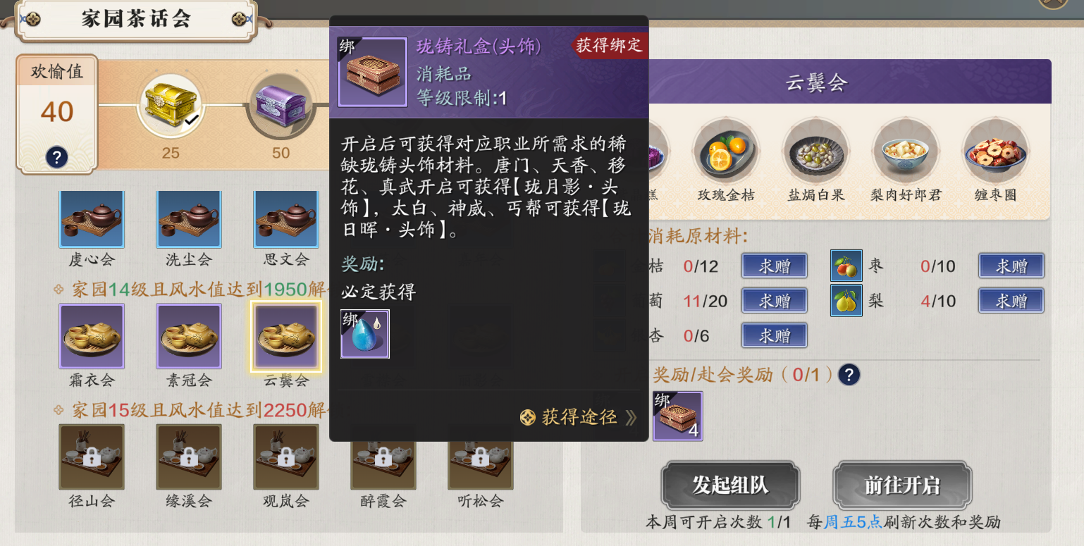 家园茶话会根据开启的档位,获取不同的珑铸礼盒,每周获取一次奖励。