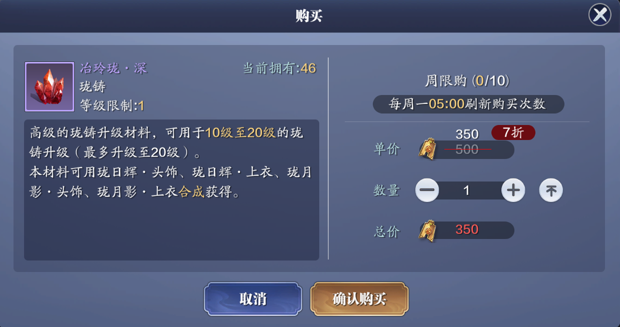 冶玲珑·初上次更新之后每周商城银两可以一次购买56个,不需要每天购买了。这也是每周冶玲珑·初的主要获取方式之一。