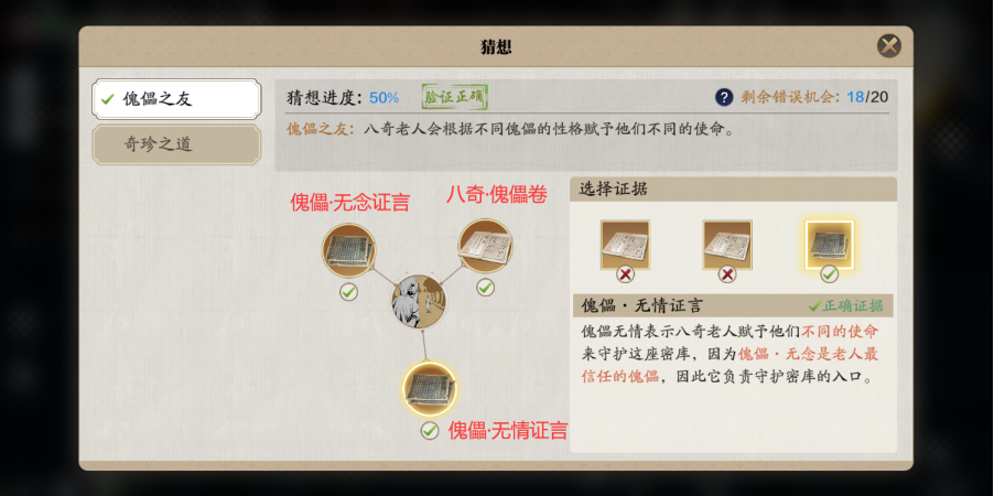 到达密室后,会遇到第一个傀儡——傀儡·无情,大胆上前去对话,获得证言“傀儡无情·证言”。