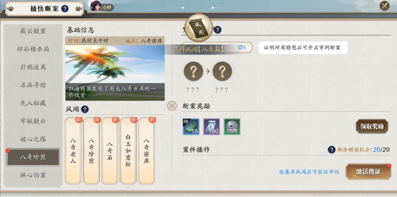 一番寒暄之后,少侠成功接到任务,并开启“捕快断案”详情页,点击“激活搜证”便可开启任务,任务奖励如下: