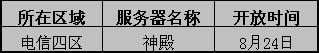 为了配合本周的更新,让玩家不会错过任何一点精彩,《武林外传》将在8月24日(本周五)再开新服“神殿”(电信4),让你过足资料片的瘾!新服新人挑战赛活动也同时开启,丰厚的金币奖励将送给“神殿”服务器的前三名新人王!