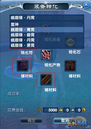 2、放入峨眉峰后,根据所选择的转换武器种类,放入不同的武勋武器、不同的浑天宝鉴,以及补天石与转化石、转化符。花费若干金币后,老绝世将转换成全新的绝世武器,此武器融合了老绝世与武勋武器的附加属性。