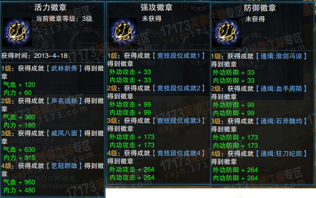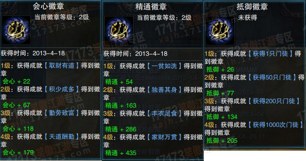 按C键,点开人物属性图,可以看到左边有个徽章的按钮。每个人,可以镶嵌最多4个徽章,每个徽章的插槽要完成特定的事件才会开启第一个,获得武林新秀成就可开启此徽章格位第二个,击杀10000只怪物可开启此徽章格位,野外多刷怪的福利么~第三个,强化10件装备到4级可开启此徽章格位(这个开启