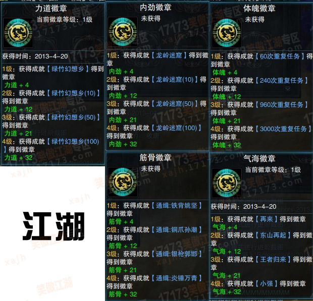 按C键,点开人物属性图,可以看到左边有个徽章的按钮。每个人,可以镶嵌最多4个徽章,每个徽章的插槽要完成特定的事件才会开启第一个,获得武林新秀成就可开启此徽章格位第二个,击杀10000只怪物可开启此徽章格位,野外多刷怪的福利么~第三个,强化10件装备到4级可开启此徽章格位(这个开启