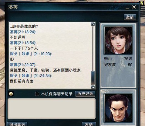 事情大致是这样的 我们行会跟一个帮敌对 行会里的几个人 跟敌对的组队刷活力 还决定结义 连做人基本的准则都没 每天几百个红利任务刷着 行会经验领着 打架了就装死 吃里扒外 还通敌 给敌对发消息说我们帮的行动 这几个人真有脸