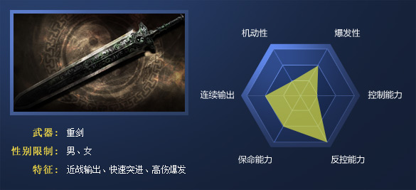 - 重剑可防御、可攻击,加之深厚内力所带来的防盾以及重剑所产生的高伤爆发,令其在武林之中所向披靡。
