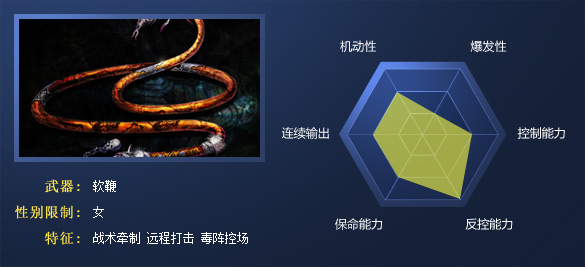 - 软鞭不仅可以远程攻击,还可将敌人定身,并拽住敌人自已拉至其身前。