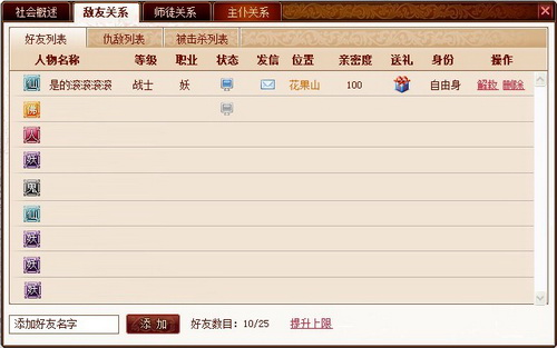 另外,需要注意好友数目是有上限的,最大为25人,当好友列表已经记录了25名好友后,你将无法添加新的好友,你可以通过点击【提升上限】来增加好友列表数目,提升后好友最表最多可以永久提升25个记录空间,使列表最大可记录50名好友。