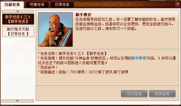 点击主界面上的“任务”按钮,弹出的窗口包括3个分页: 当前任务:显示了当前角色已经接受,且在进行中的任务。点击【传送】按钮或者点击任务指南中的【怪物】/【NPC】名字,就可以立刻传送到任务地点。 可接任务:显示了当前角色等级范围段内可以接的任务,以及再过几级马上可以接的几个任务。可接任务,显示3-5级以内玩家可以接的任务。 日常任务:显示角色可以接受并完成的日常任务。