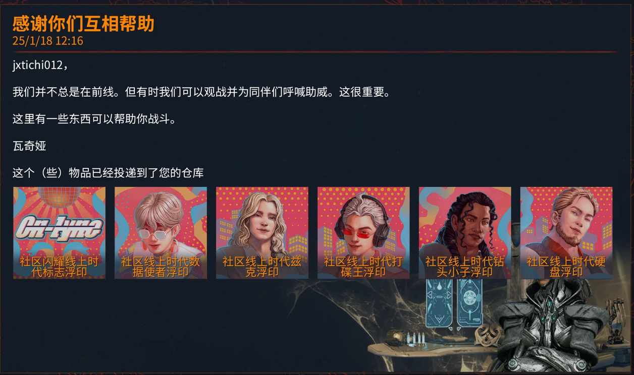 第一轮为在 1 月 25 日凌晨 0 点之前于 Twitch 上观看任意 Warframe 直播,每观看 30 分钟即可获得一个光辉岁月线上时代浮印
