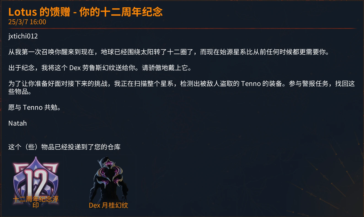 来自:https://www.warframe.com/zh-hans/news/12-year-anniversary-zh-hans