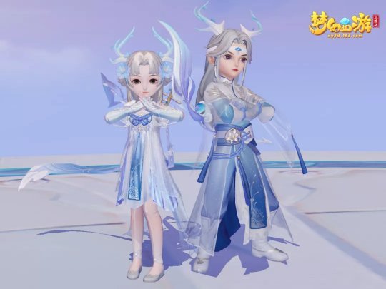 穿上“白鹿凝霜”的少侠,银白色飘逸长发与蓝白色渐变鹿角相得映彰,一席长袍加身更显体态修长,辅以小花纹精巧点缀,大气不失儒雅!穿上“白鹿凝霜”的女侠,鹿角旁绽放出淡蓝色花朵,及膝裙摆与飘带随风而舞,又多了一分俏皮灵动!