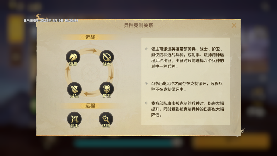 近战兵种存在骑兵→战士→护卫→游侠→骑兵的循环克制关系,远程兵种不存在克制关系,克制兵种对阵被克制兵种时,输出伤害会提升,受到的伤害会降低。