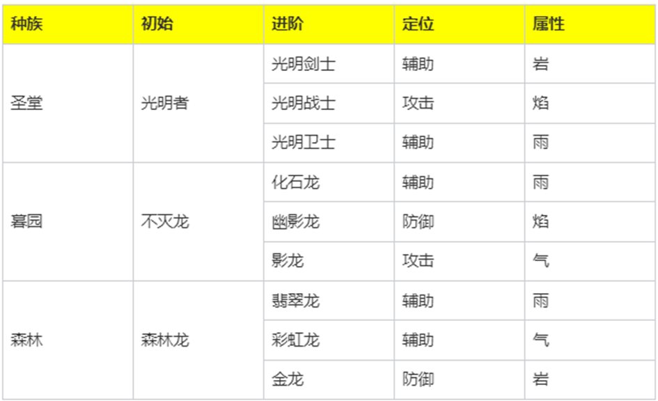 目前游戏中共有圣堂、暮园、森林三大种族可供选择,差异主要体现在兵种和初始冠军生物上,其余功能建筑完全相同。