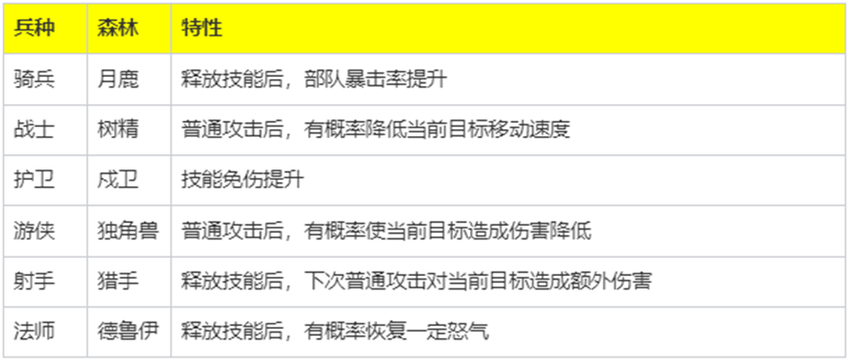 特性是指兵种拥有的被动效果,各种族兵种特性各不相同,但属性数值不存在差异,一下为兵种特性介绍。