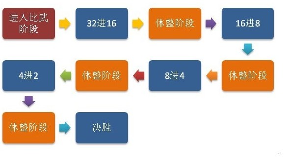 2.【**论剑比武阶段】分【32进16】、【16进8】、【8进4】、【4进2】、【决胜】5个【子比武阶段】,以淘汰赛规则进行。