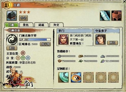 主殿:对玩家的门派信息进行总揽。可以接受一些任务,设置门派的守备弟子,查询玩家目前的成就获得情况,查询玩家门派目前在游戏中与其他NPC势力的外交关系。如果其他玩家来拜访自己的门派,点开主殿后,将只能看到门派信息和成就。