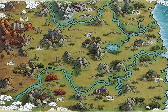 目前游戏世界地图由八个地区组成,西域和大漠区域暂时未开放,每个地区中包含有不同的城镇、村庄、NPC门派、副本、资源。