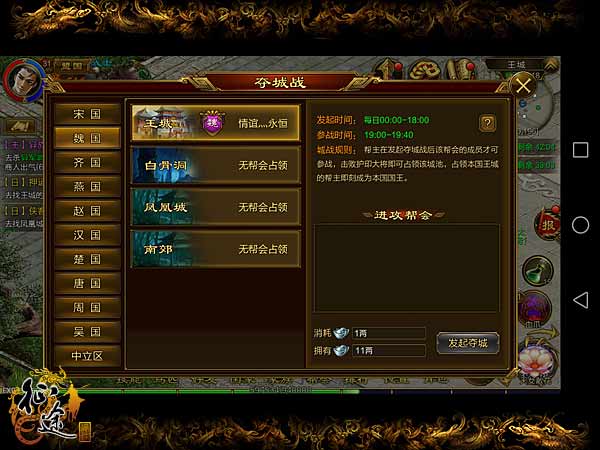 夺城战是帮派实力的完美展现,占领本国王城的帮主便会登基成为本国国王。一将功成万骨枯,想要成为主城的的占领者,必须在夺城战中最后击杀“护印大将”。因此,有实力的帮派帮主发起夺城战后,一场血战在所难免。夺城战的参战时间是每晚19点至19点40分,扬名立万的时间千万不要错过。