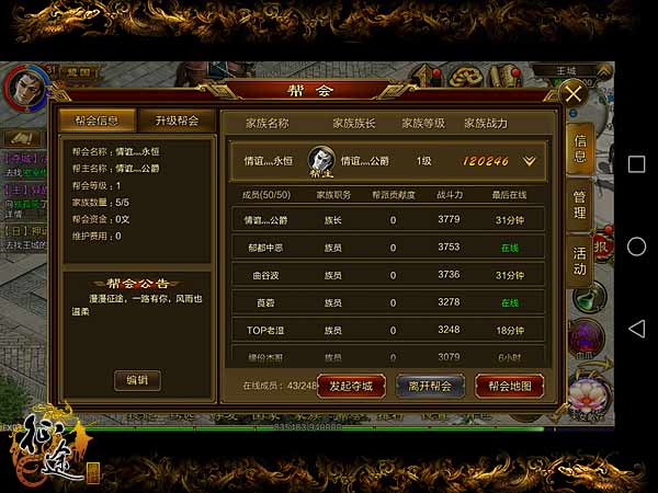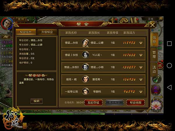《征途手机版》开启了一个广阔的交互平台,15级便能体验家族玩法,30级后更可以参与帮会玩法,为我们的征途提供更大的施展舞台。 如果说家族像玩家间组建的家庭,那么帮会则是家族抱团取暖的地方。一个强大的帮会依赖于加入其中家族的强大,因此只有家族族长才可以申请加入帮派。如果当家族