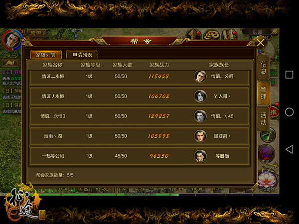 在帮会信息中,会显示当前加入家族的名称、族长姓名、家族等级和家族的总战力。家族的战力是反应一个家族强大的标志,更高的战力往往意味着战斗的胜利。每个帮会能容纳的家族数量为5个,只有5个家族一起努力,才能建设一个强大的帮会。点开每个家族,还能查看家族的成员和他的战斗力。