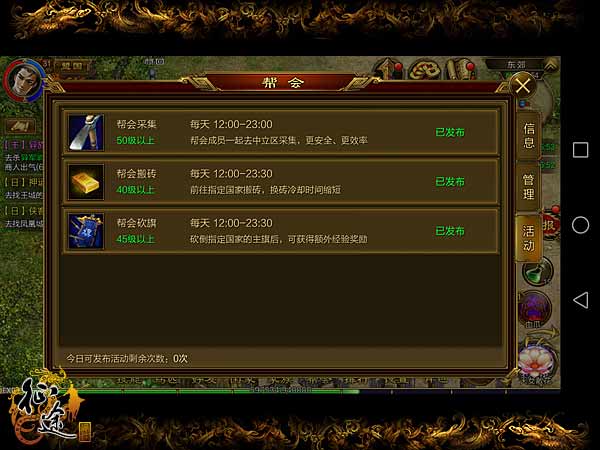 在帮会活动列表中,有三大精彩活动供大家参与。但帮会活动对玩家的要求显然比家族更高,三大活动中,要求最低的帮会搬砖也需要最低等级为40级。每天中午12点至晚上23点之间是帮会活动的可发布时间,休闲些的玩家可以和帮会成员一起到中立区采集,既安全又有效率的完成帮会采集任务,国战控的玩家可以参与帮会砍旗活动,砍倒指定国家的主旗,额外获得经验奖励。