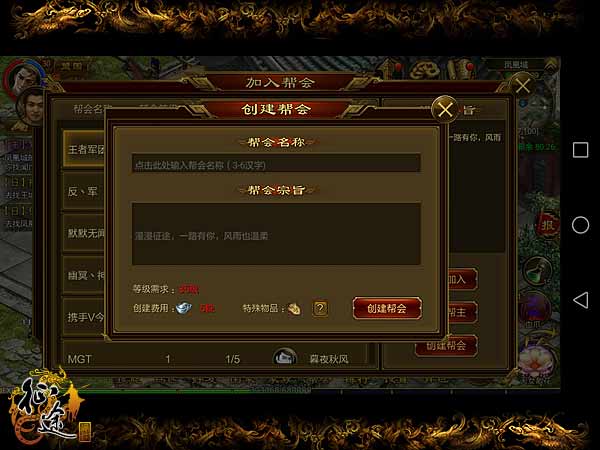 如果说家族像玩家间组建的家庭,那么帮会则是家族抱团取暖的地方。一个强大的帮会依赖于加入其中家族的强大,因此只有家族族长才可以申请加入帮派。如果当家族族长还不能过把瘾,现有的帮会又不想加入,那么当等级达到35级后,也可以花费5锭绑银和特殊道具来创建一个新的帮会。