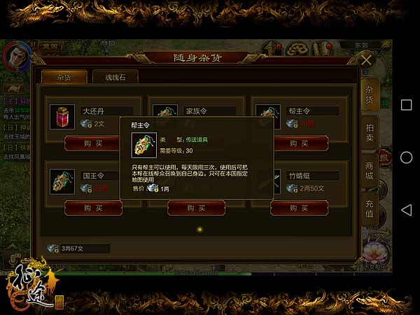 在商城中,有一个帮主专用的特殊道具——帮主令。帮主令只能由帮主使用,每天的限用次数是三次。在本国地图使用后,帮主令可以把本帮在线帮众召唤到自己身边,很拉风有没有?