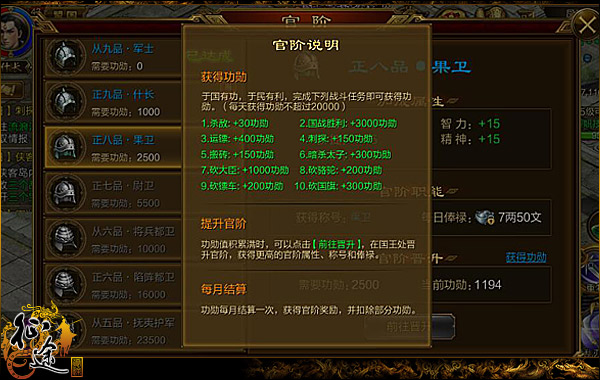 注意事项:功勋值每月结算一次,获得官阶奖励,并扣除部分功勋。
