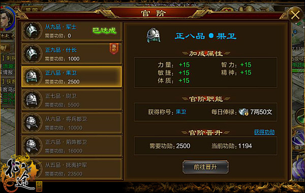 提升官阶:功勋值积累满时,可以点击“前往晋升”,在国王处晋升官阶,获得更高的官阶属性、称号和俸禄。